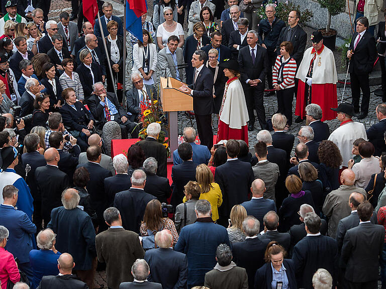 Nach einer Rede des Bellinzoneser Gemeindepräsidenten, der insbesondere Didier Burkhalter und den letzten Tessin Bundesrat Flavio Cotti begrüsste, zog die Empfangsdelegation bei strahlender Tessiner Herbstsonne in einem grossen Umzug und begleitet von vielen fähnchenschwingenden Schülerinnen und Schülern zum Regierungsgebäude. Auch eine Begegnung mit der Bevölkerung stand auf dem Programm (sda)