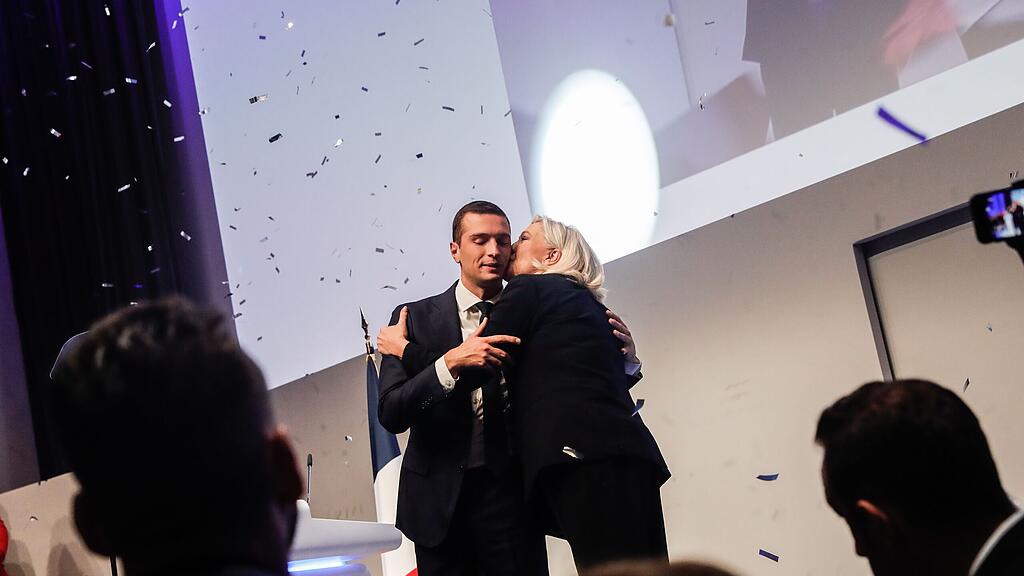 Gratulation von der Chefin – Marine Le Pen küsst Jordan Bardella.