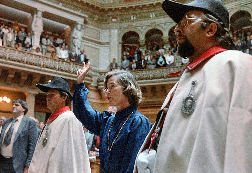 Vereidigung der ersten Frau zur Bundesrätin: In Begleitung von zwei Weibeln hebt Elisabeth Kopp am 2. Oktober 1984 in Bern bei ihrer Vereidigung im Nationalratssaal die rechte Hand zum Schwur.