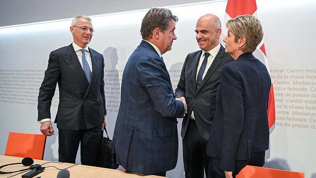 Ein Deal für die Geschichtsbücher: Die UBS kauft mit Staatshilfe die Credit Suisse – besiegelt von CS-Präsident Axel Lehmann, UBS-Präsident Colm Kelleher, Bundespräsident Alain Berset und Finanzministerin Karin Keller-Sutter (v. l.).