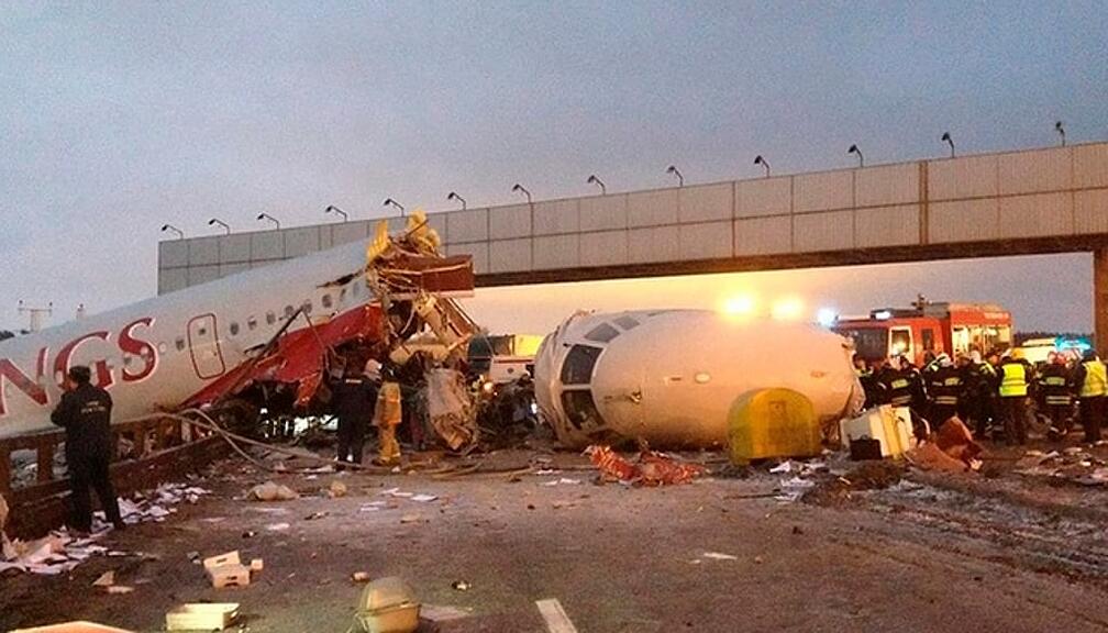 Dezember 2012: Auf dem Moskauer Flughafen Wnukowo schiesst ein Flugzeug über die Landebahn hinaus und durch einen Zaun auf eine Strasse. Fünf Insassen sterben, weil vermutlich die Bremsen versagten.