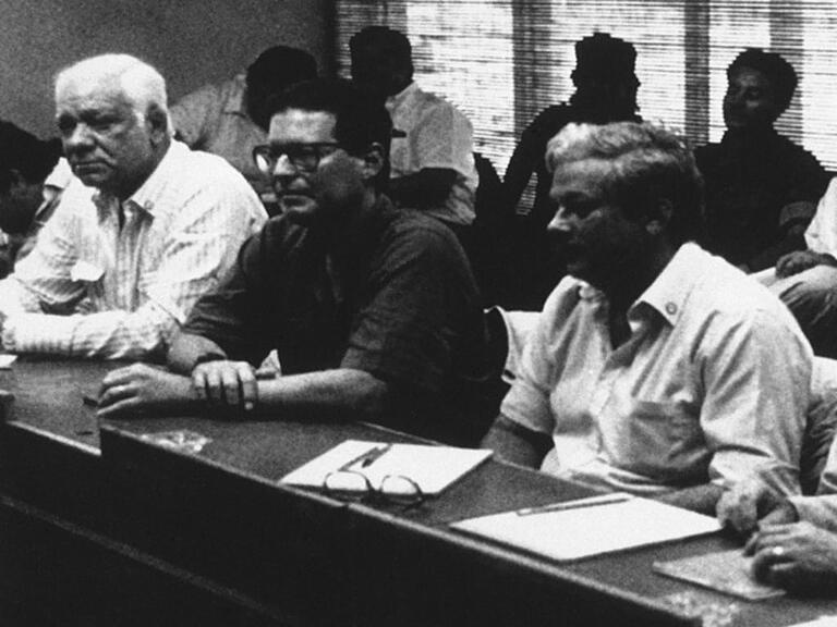 Der Anführer der Contra-Rebellen, Adolfo Calero (links), am 21. März 1988 bei einem Gespräch mit den Sandinisten in Nicaragua (Archiv)