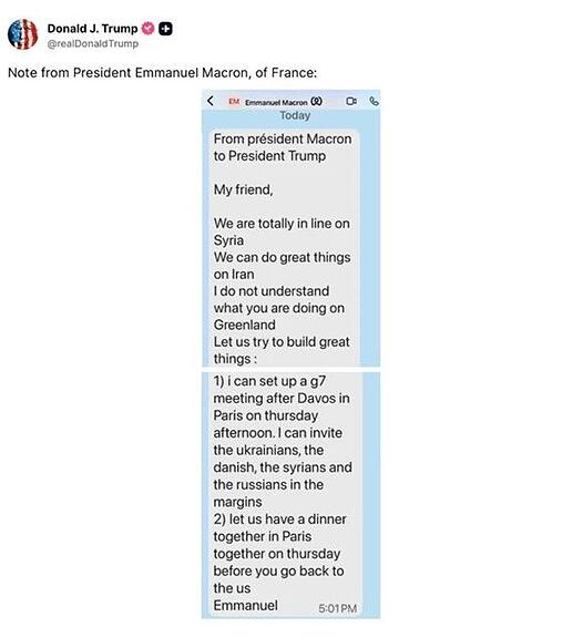 Am Dienstagvormittag hatte Trump auf seinem Online-Sprachrohr Bilder veröffentlicht, die Textnachrichten von Macron zeigen sollen. Darin regt Macron ein Treffen der grossen westlichen Industrienationen in Paris nach dem Ende des Weltwirtschaftsforums in Davos an. Hinzustossen sollen demnach nach seiner Ansicht auch Vertreter der Ukraine, Dänemarks, Syriens und Russlands.