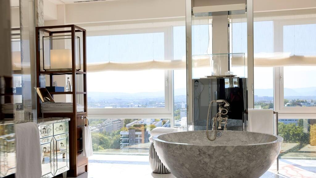In der Mitte des Zimmers thront eine runde Badewanne aus Marmor. Die Spiegel an den Wänden reichen bis zur Decke. Und eine grosszügige Dusche hinter Glasscheiben und ein Hamam gibt es ebenfalls. Wir befinden uns auf der 18. Etage des Hotels Intercontinental in Genf. Genauer gesagt im Badezimmer der «Residence Suite», die ab 25'000 Franken pro Nacht zu haben ist. Hier hat der frühere US-Präsident Joe Biden geduscht, als es 2021 in der Stadt zum Gipfeltreffen mit Wladimir Putin kam.