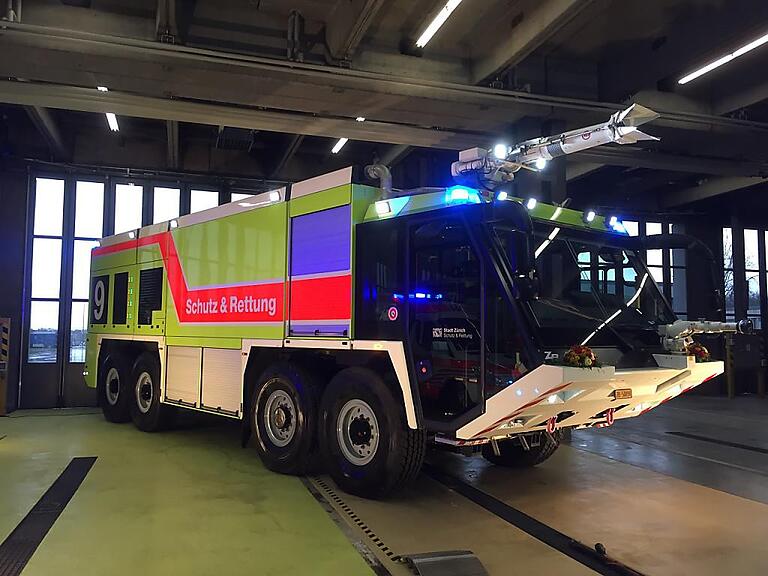Die Zahlen zum "Z8" sind imposant: Das Ziegler-Fahrzeug ist 48 Tonnen schwer, fasst 12'500 Liter Wasser respektive 1500 Liter im Schaummitteltank, und die Löschpumpe hat eine Kapazität von 10'000 Litern pro Minute. 1250 PS beschleunigen das "Z8" auf maximal 140 km/h. Das ist wichtig für den Flughafen: Innert drei Minuten müssen über 32'000 Liter Wasser an jeden Ort des Areals gebracht werden können.