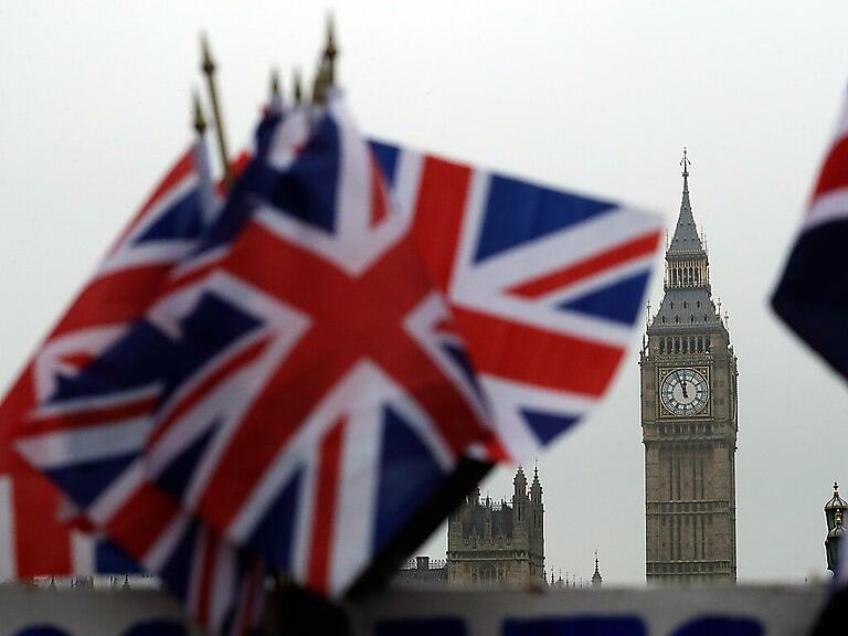 ARCHIV - Britische Flaggen wehen in der Nähe des berühmten Uhrturms Big Ben. Der Uhrturm ist Teil des Palace of Westminster, in dem das britische Parlament tagt. Foto: Matt Dunham/AP/dpa