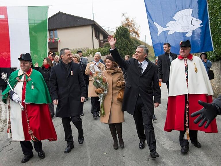 In Begleitung seiner Frau Friedrun Sabine verliess Didier Burkhalter das Schiff und wurde von der Neuenburger Stadtregierung, der er selber einmal angehörte, empfangen. Danach gab es einen Umzug in den Musiksaal "Temple du Bas", wo die offizelle Feier stattfand.