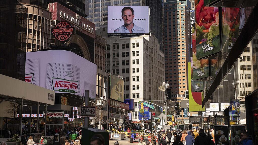 Der US-Journalist Evan Gershkovich auf einem Plakat am New Yorker Times Square: Der Reporter wurde in Russland zu 16 Jahren Haft verurteilt.