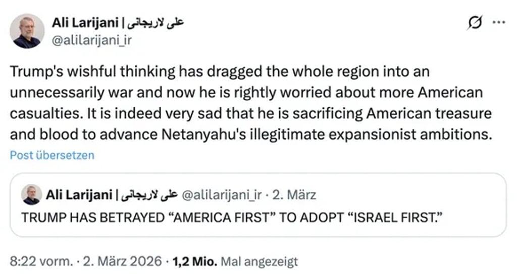 Nach aussen zeigt sich Laridschani zunehmend kämpferisch. In sozialen Medien, insbesondere auf X, reagiert er auf Angriffe mit scharfen Worten und attackiert dabei offen Donald Trump.