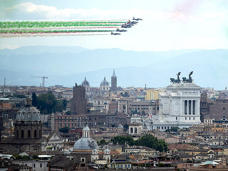 Am Vormittag rauschten Militärflugzeuge über das Nationaldenkmal Altare della Patria im Herzen Roms und versprühten die Farben der italienischen Flagge, während Staatspräsident Sergio Mattarella dort einen Kranz niederlegte.