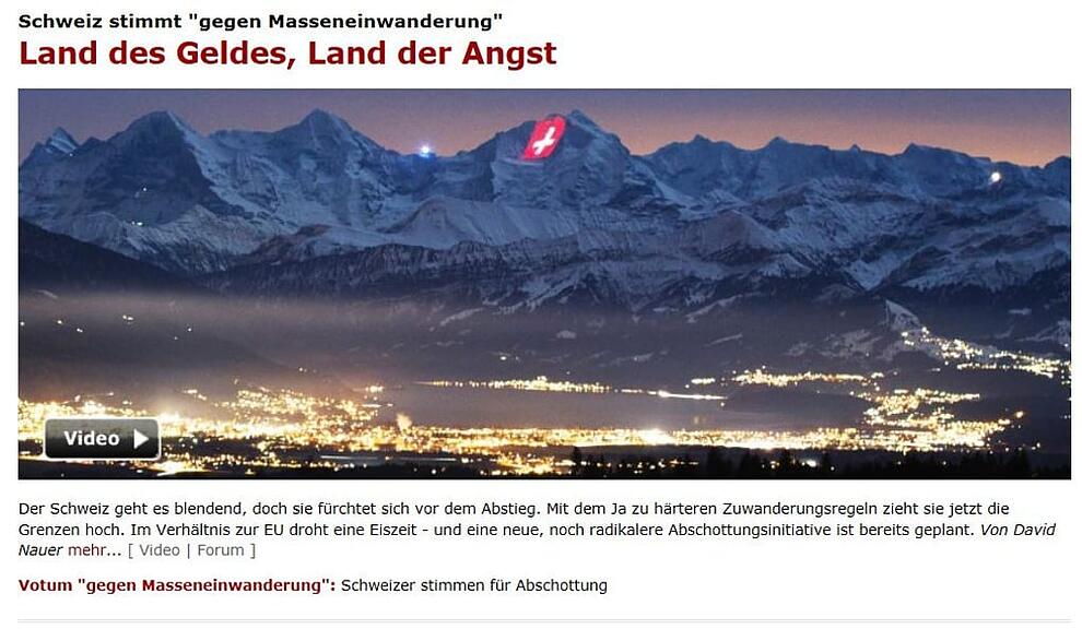 Unter dem Titel "Schweizer stimmen für Abschottung" wird auf "Spiegel Online" auf das knappe Resultat hingewiesen. Abgedruckt wurde aber ein vom Autor ergänzter Agenturtext, der sich vorwiegend nach den Fakten richtete. Im Kommentar "Land des Geldes, Land der Angst" heisst es: "Wer viel hat, der hat auch viel zu verlieren. Und die Aussicht, die angehäuften Franken mit Zuwanderern teilen zu müssen, wächst sich da schnell zur Existenzangst aus. Überspitzt gesagt: Es bleibt nicht mehr viel übrig vom Schweizer-Sein, wenn man auf einen Lebensstandard abrutscht wie in Deutschland oder - Gott bewahre - wie in Frankreich oder gar Italien. "