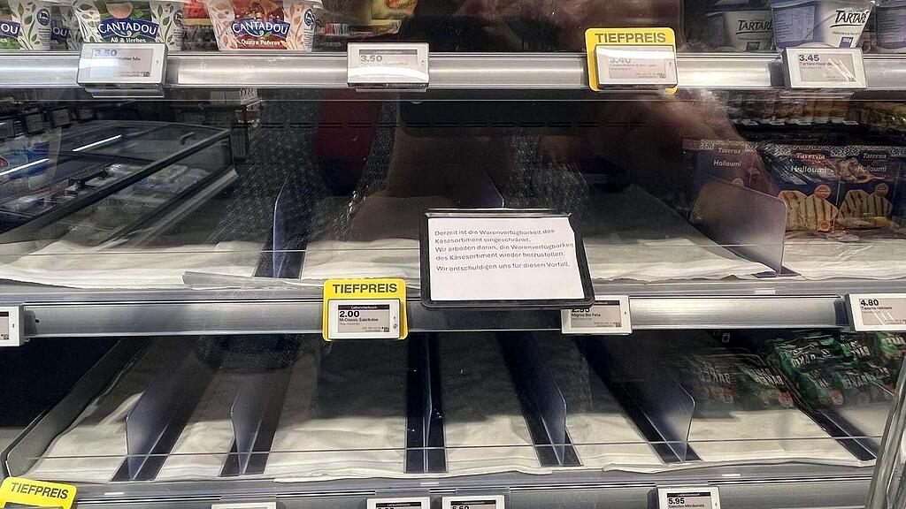 Die gelben Schildchen im Käse-Regal versprechen «Tiefpreise», doch die entsprechenden Waren dazu sind nicht da: Der M-Classic-Salatkäse fehlt ebenso wie der Salakis-Feta. In der Migros-Filiale am Burgernziel in Bern gibt es statt Käse nur einen weissen Notizzettel: «Derzeit ist die Warenverfügbarkeit des Käsesortiments eingeschränkt», heisst es da. «Wir arbeiten daran, die Warenverfügbarkeit des Käsesortiments wieder herzustellen.» Und: «Wir entschuldigen uns für den Vorfall.»