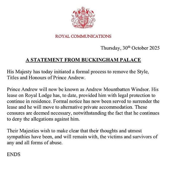 Der britische König Charles III. entzieht Prinz Andrew auch noch seine restlichen Titel. Der 65-Jährige werde fortan als Andrew Mountbatten Windsor und nicht mehr als Prinz bekannt sein, teilte der Buckingham-Palast am Donnerstagabend mit. Zudem müsse Andrew aus seinem Anwesen Royal Lodge ausziehen.