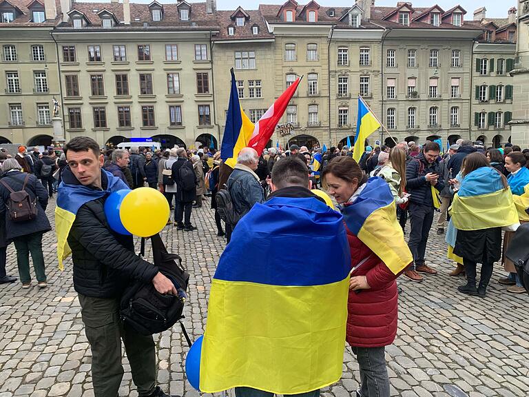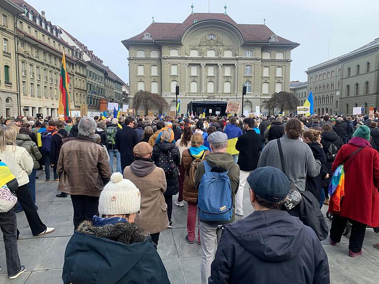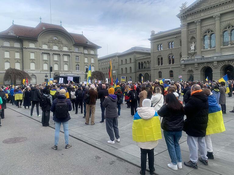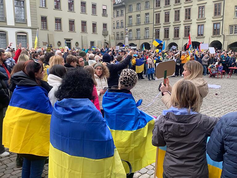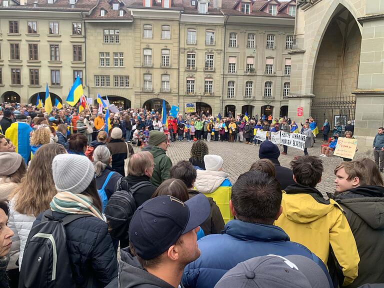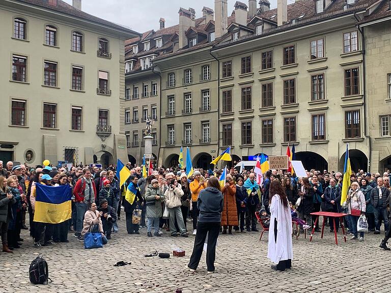 Mehrere Demonstrierende trafen sich am Samstagnachmittag am Münsterplatz und zogen anschliessend durch die Berner Innenstadt auf den Bundesplatz. Dort fanden mehrere Reden statt, unter anderem von der ukrainischen Botschafterin in der Schweiz sowie einem ehemaligen Bürgermeister der schwer getroffenen Stadt Mariupol.