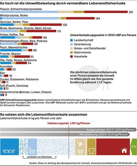 Fleisch und Milchprodukte, die nicht gegessen werden, verursachen dabei den grössten ökologischen Schaden. Besonders problematisch: Sie landen oft am Ende der Wertschöpfungskette im Abfall. Wenn ein Joghurt oder der Lyoner in den Abfall wandern, wurden die Ressourcen für die Herstellung und den Vertrieb vergeblich verbraucht.
