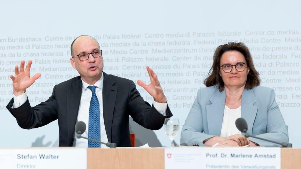 Direktor Stefan Walter und Präsidentin Marlene Amstad an der Jahresmedienkonferenz der Finanzmarktaufsicht.