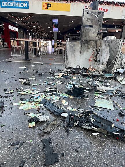 Auch im Fall des Angriffs in Marin spricht die Kantonspolizei Neuenburg in einem Communiqué von erheblichen Schäden. Bilder zeigen das Ausmass der Zerstörung: Zerborstene Glasscheiben, demolierte Metallgehäuse – und am Boden verteilte 100-Franken- und 200-Franken-Nötli.