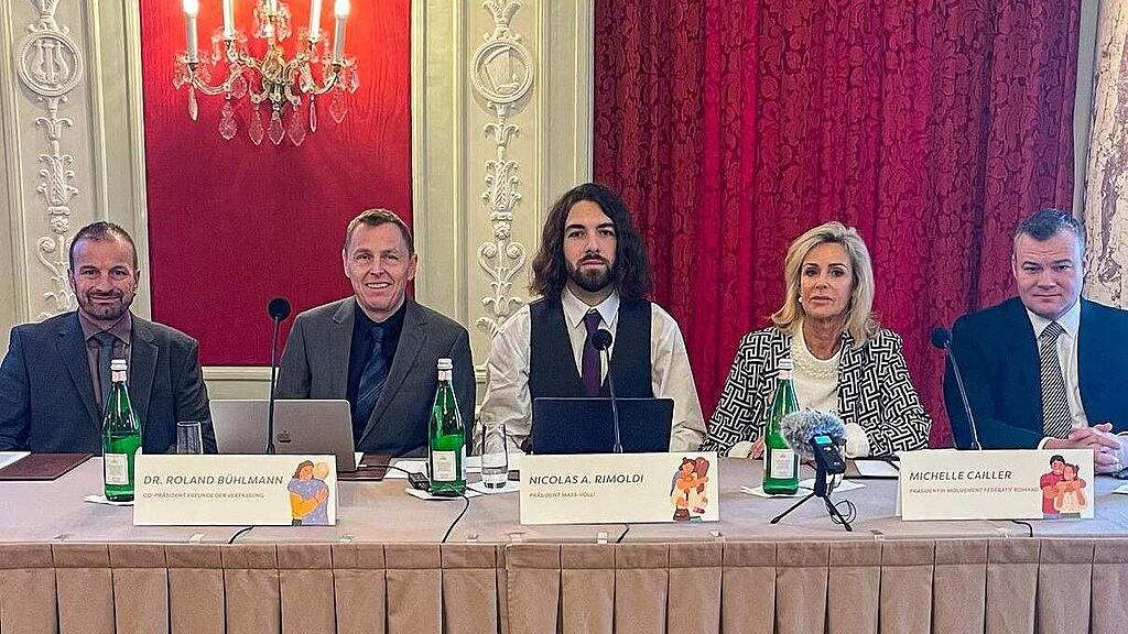 Am 16. Dezember letzten Jahres haben sie das Referendum gegen die Verlängerung des Covid-Gesetzes im Hotel Bellevue Palace in Bern lanciert (von links nach rechts): EDU-Nationalrat Andreas Gafner, Roland Bühlmann, Co-Präsident Freunde der Verfassung, «Mass-voll!»-Präsident Nicolas Rimoldi, Juristin Michelle Cailler und Martin Hartmann, Präsident Libertäre Partei.