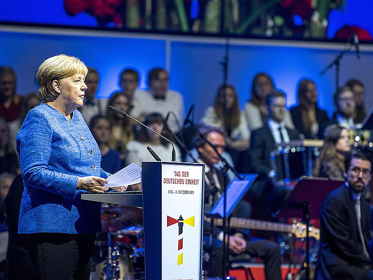 Zwar seien alle Deutschen heute "mit ihrem Leben insgesamt zufriedener als zu jedem anderen Zeitpunkt nach der Vereinigung", sagte Merkel am Donnerstag beim Festakt zum Tag der Deutschen Einheit in Kiel.
