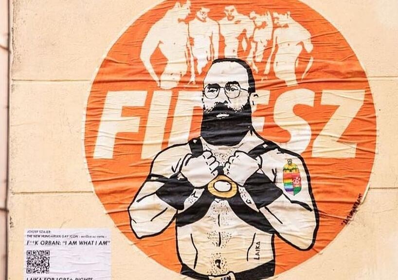 Darauf wies nun auch eine italienische Street-Art Künstlerin hin, die Joszef Szajer mit einem Bild in Rom ein Denkmal gesetzt hat. «Jozsef Szajer: die neue ungarische Schwulenikone» heisst das Werk und zeigt den bärtigen EU-Parlamentarier mit nacktem Oberkörper und Ledergurt. Sein Arm ziert eine Tätowierung mit einem Wappen in den Farben der Regenbogenfamilie. Im Hintergrund das Logo von Orbans Fidesz-Partei und eine Gruppe nackter Männer. «F**k Orban! I am what I am» - «Scheiss auf Orban, ich bin, was ich bin», lautet die Bildunterschrift.