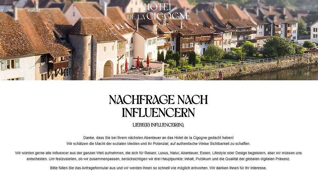 «Wir schätzen die Macht der sozialen Medien und ihr Potenzial, auf authentische Weise Sichtbarkeit zu schaffen.» Mit diesen Worten wendet sich das Hôtel de la Cigogne auf seiner Website direkt an Influencerinnen und Influencer. Das kleine 4-Sterne-Hotel liegt abseits der ganz grossen Touristenströme, nämlich im Herzen des jurassischen Städtchens St-Ursanne. Doch es bekommt so viele Anfragen von Influencern, dass es nur einen Bruchteil davon annehmen kann.