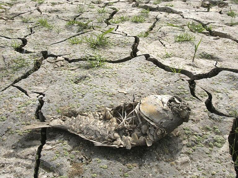 Ein toter Fisch liegt in einem ausgetrockneten Flussbett