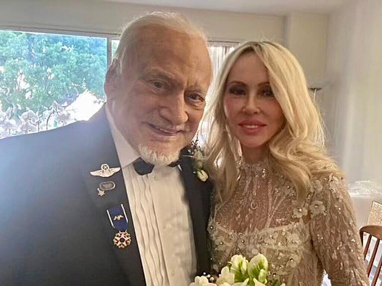 Dazu stellte Aldrin am Freitag im Onlinedienst Twitter Fotos von sich und seiner Frau - sie zeigten ihn im Smoking und Faur in einem weissen, durchsichtigen und bestickten Spitzenkleid mit Brautstrauss.