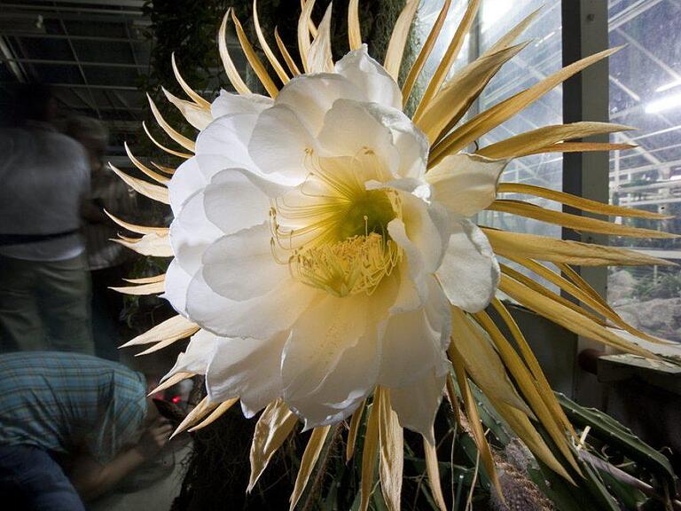 Die sonst unscheinbare Pflanze zeigt ihre Pracht höchstens einmal im Jahr. Beim Blühen verliert der Kaktus "Selenicereus grandiflorus" eine beträchtliche Menge Wasser. Dies kann sich eine wasserspeichernde Pflanze selten leisten und zudem nur nachts, wenn die Luftfeuchtigkeit grösser ist. Bei Sonnenaufgang schliessen sich deshalb die riesigen Blüten wieder.