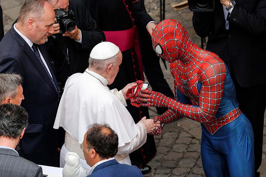 Zu dieser kuriosen Begegnung mit Spiderman kam es im Juni 2021. Ob Franziskus die Maske in der Abgeschiedenheit seiner privaten Gemächer aufsetzte?/>