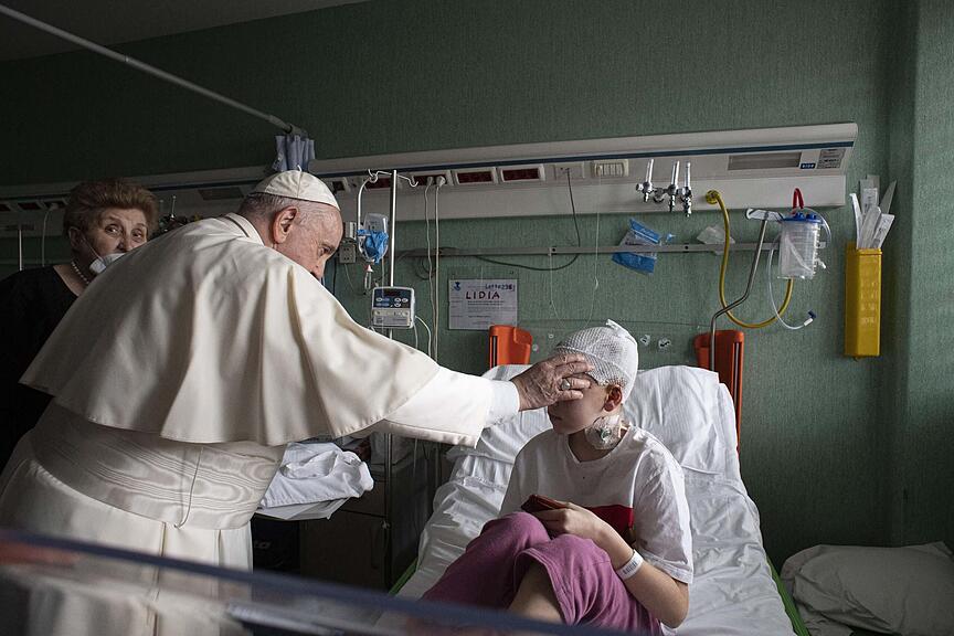 Den Ukraine-Krieg verurteilte Papst Franziskus und betete für Frieden. Er besuchte hospitalisierte Kinder aus der Ukraine in einem italienischen Kinderspital und gab ihnen seinen Segen./>