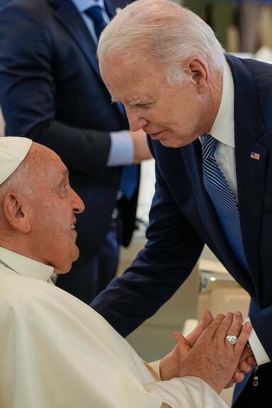 Im vergangenen Jahr traf Papst Franziskus beim G7-Gipfel in Italien auf den damaligen US-Präsidenten Joe Biden./>