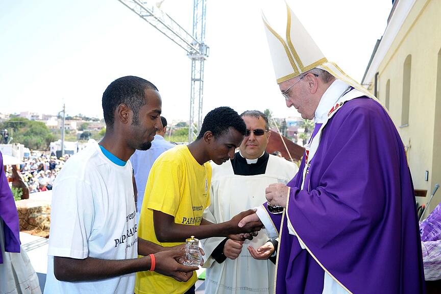 Seine erste Reise als Papst führte Franziskus auf die italienische Flüchtlingsinsel Lampedusa. Er kritisierte die Gleichgültigkeit der Europäer und legt einen Kranz für die schätzungsweise 20.000 Menschen nieder, die auf der Flucht ums Leben gekommen sind./>