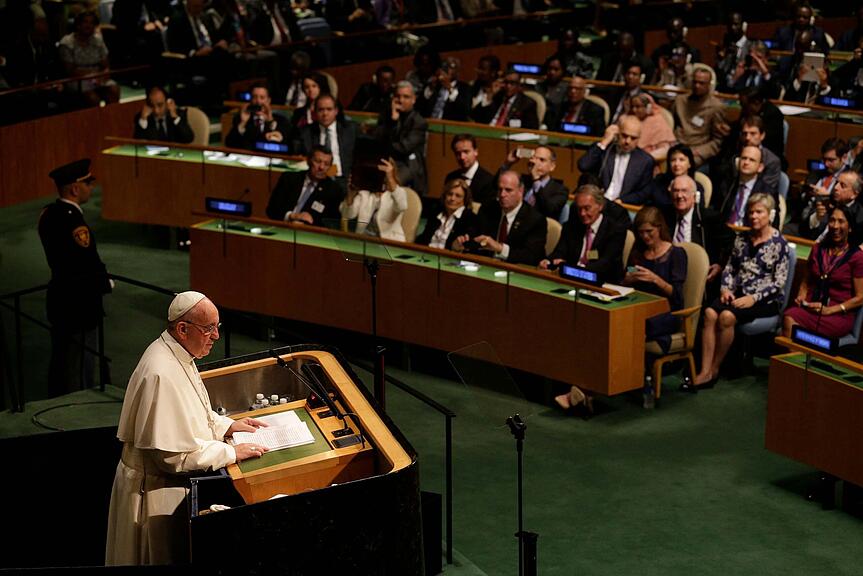 2015 sprach er während seiner USA-Reise vor der UNO-Vollversammlung und forderte unter anderem mehr Klima- und Umweltschutz./>