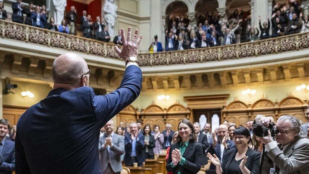 Spätestens, als Martin Pfister zur Posaune greift, fällt die Anspannung von ihm ab. Es ist kurz nach 11 Uhr, als der neugewählte Bundesrat aus dem Bundeshaus tritt - und von Pauken und Trompeten empfangen wird. Die Fasnachtsmusik Snäfuu, bei der er selbst Mitglied ist, ist nach Bern gereist, um «ihrem» Bundesrat ein Ständchen zu spielen. Pfister ziert sich erst, dann nimmt er das Instrument und stimmt ins Blaskonzert ein.