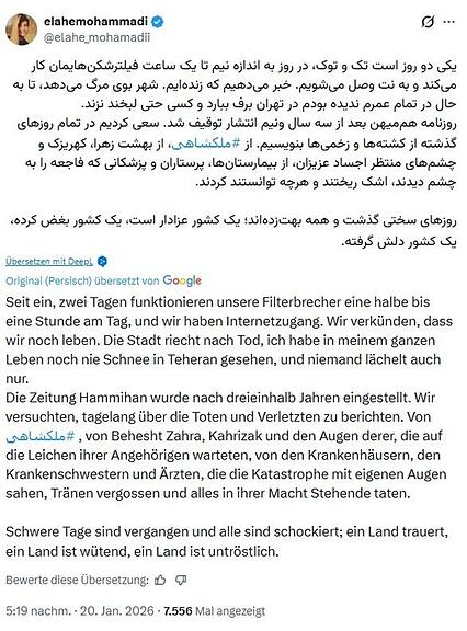 Bei den Massenprotesten im Iran könnten deutlich mehr Menschen getötet worden sein als bislang bekannt. Das Menschenrechtsnetzwerk HRANA mit Sitz in den USA meldete nach eigenen Angaben 5137 bestätigte Todesopfer. Zusätzlich prüft HRANA 12'904 weitere Fälle. Außerdem sollen mindestens 7402 Menschen schwer verletzt worden sein.