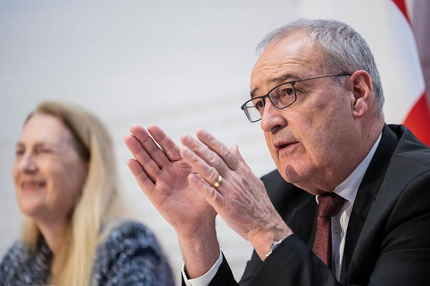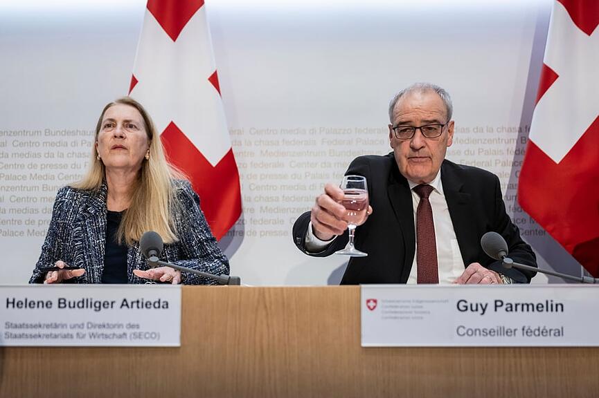 Die Medienkonferenz startet. Wirtschaftsminister Guy Parmelin wird begleitet von Helene Budliger Artieda, Staatssekretärin für Wirtschaft.