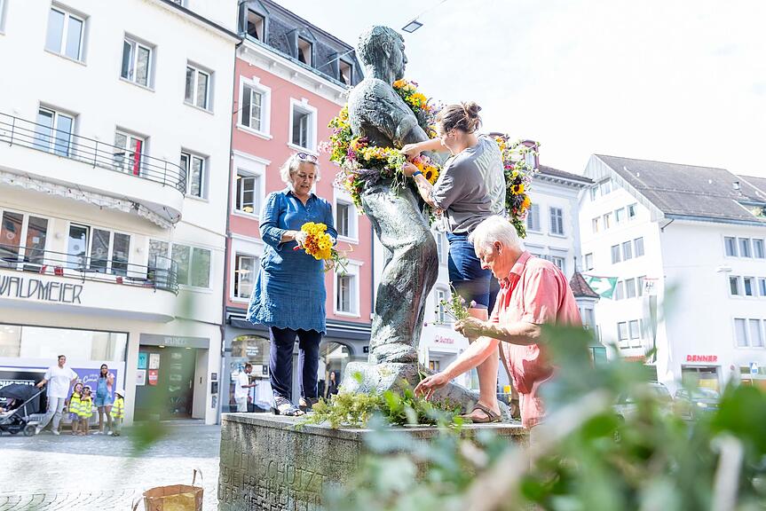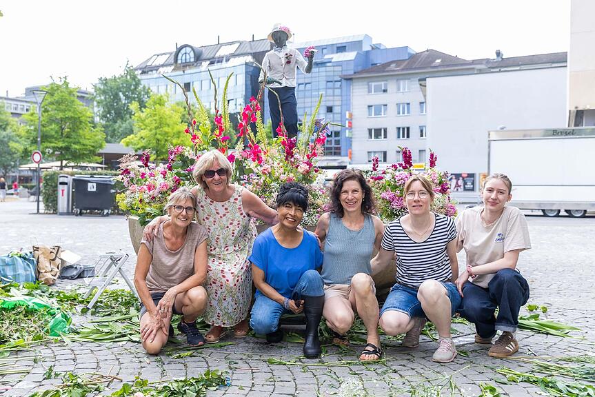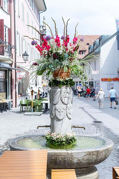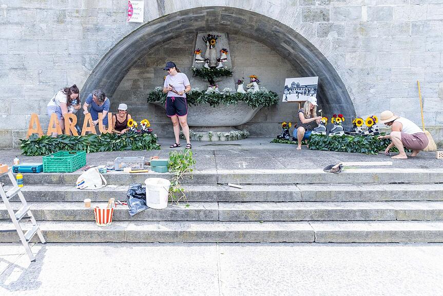 Der Brunnen am Aargauerplatz wurde von Katharina Brukner, Kathrin Bachmann, Diana Eberhardt, Fiona Hasler, Dagmar Lindermann und Melanie Eberhardt (v.l.n.r.) geschmückt. Unter dem Motto «Kunst, Einmalig, Blumen, Aarau» haben sie eine Hommage an die KEBA und Blumen für die Kunst in Aarau erschaffen/>