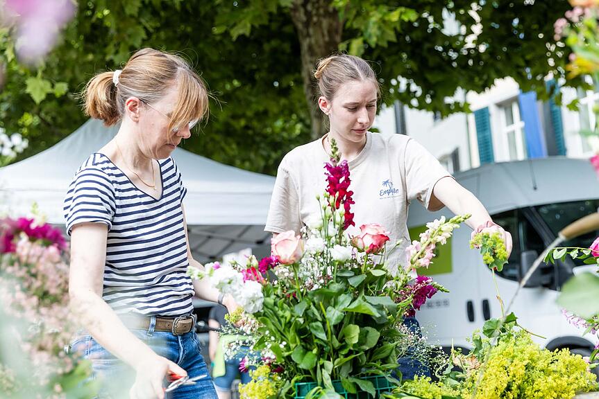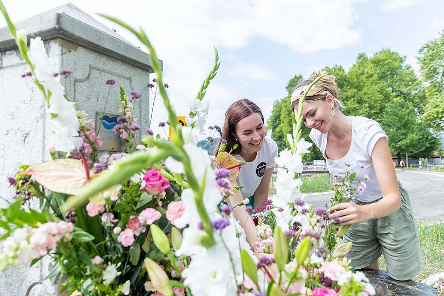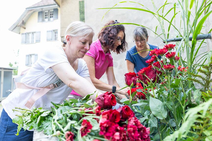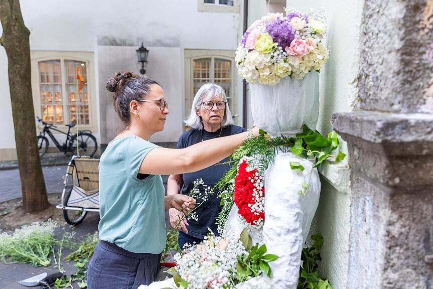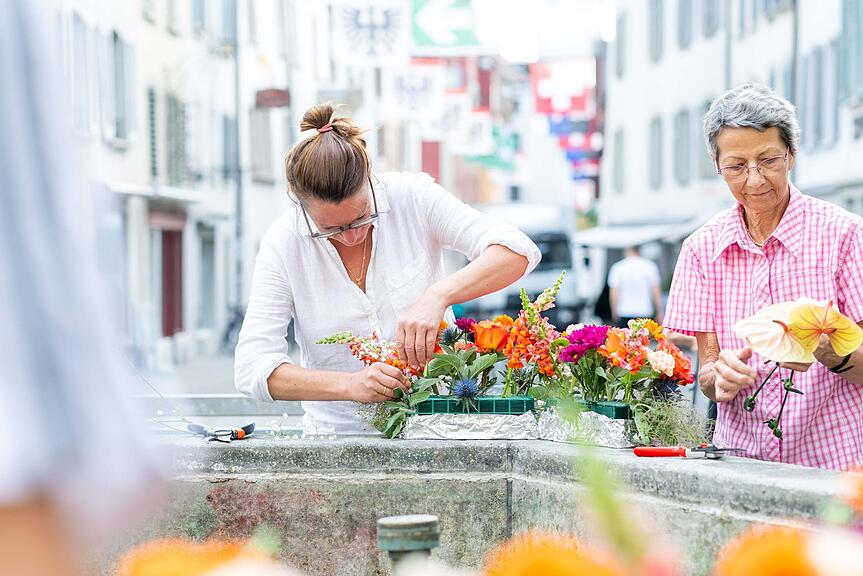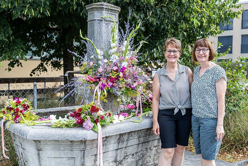 Eliane (links) und Bernadette Baertschi schmücken den Brunnen im Schultheisshöfli und haben eine Hommage an die Blumenfrauen kreiert./>