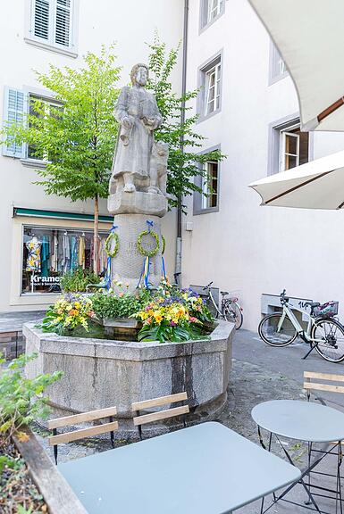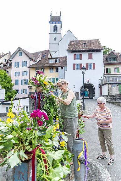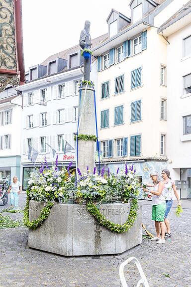 Der Bezirksbrunnen wurde von Esther Brand, Eva Bossert und Regula Guignard dekoriert./>