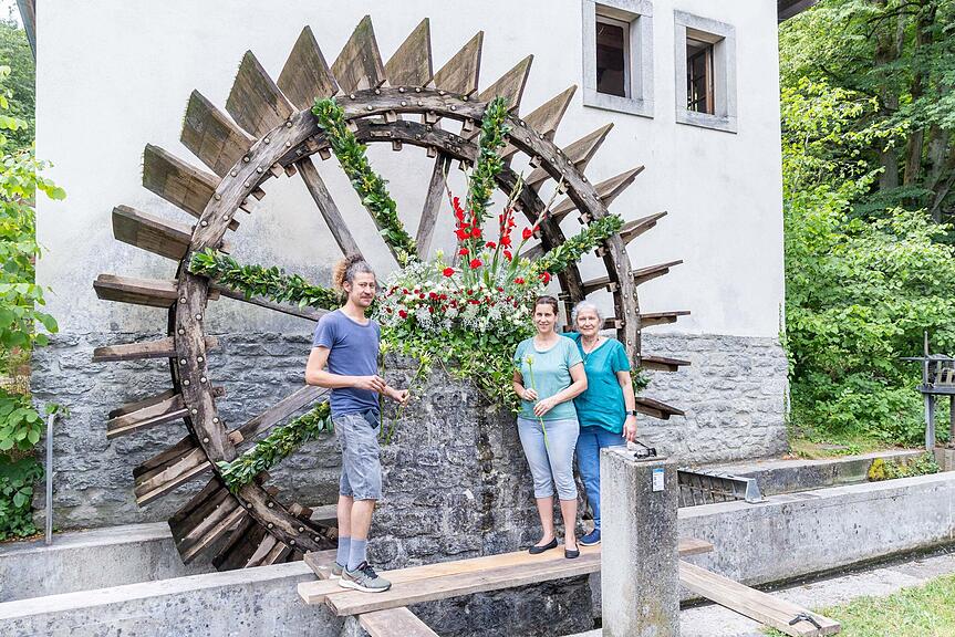 Christian Zürcher, Martina Eichenberger und Elisabeth Zürcher haben in diesem Jahr erstmals das Mühlerad geschmückt. Das Motto: Ein Maienzugs-Feuerwerk./>