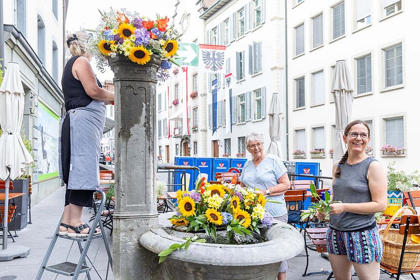 Dorothea Meier, Ursula Baumann und Ines Pfister schmücken gemeinsam den Brunnen am Zollrain – in diesem Jahr bunter als gewohnt./>