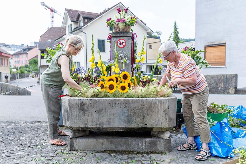 Beatrice Kuhlmann und Hildegard Matt dekorierten gemeinsam den Chatzenpfötlibrunnen./>