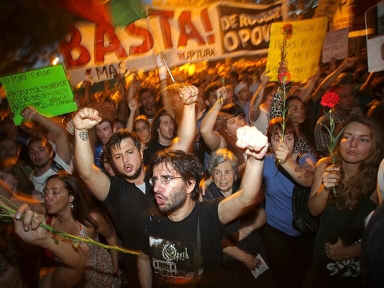 Rund 50 Polizisten hielten die Protestteilnehmer vom Präsidentenpalast fern, in dem der sogenannte Staatsrat neue Sparvorhaben der Regierung diskutierte. Die Demonstranten hielten Bilder von Ministerpräsident Pedro Passos Coelho hoch.
