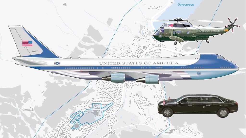 Donald Trump reist 2026 zum dritten Mal ans WEF nach Davos. Zeitpunkt und Ablauf seiner Ankunft bleiben geheim, die Sicherheitsvorkehrungen sind enorm. Für den Schutz des US-Präsidenten sorgt vor allem eine umfangreiche amerikanische Sicherheitsinfrastruktur - unterstützt von Schweizer Behörden. Wir zeigen, wie Trumps Reise von den USA bis nach Davos genau abläuft.