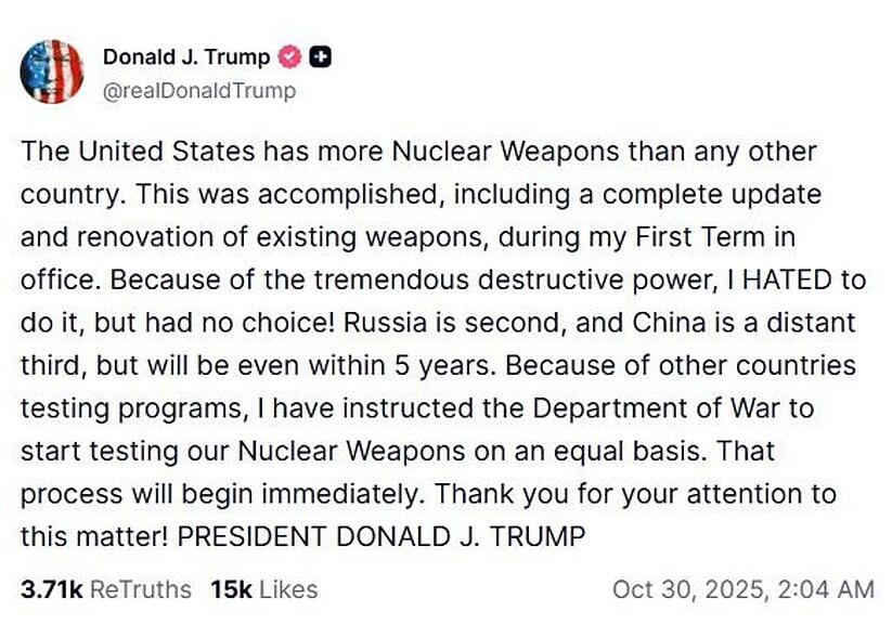 US-Präsident Donald Trump hat den sofortigen Beginn neuer Atomwaffentests angekündigt. Er begründete die Massnahme in einem Post auf der Plattform Truth Social mit den Testprogrammen anderer Länder. Er habe das jüngst in Kriegsministerium umbenannte Verteidigungsministerium angewiesen, Tests «auf gleicher Basis» durchzuführen, schrieb Trump weiter.