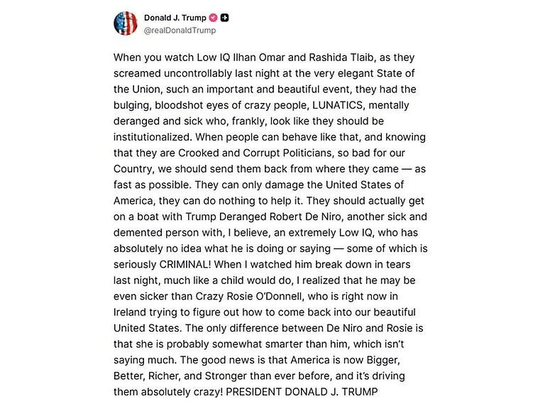 Trump liess ein kürzlich von ihm verbreitetes rassistisches Video über den früheren Präsidenten Barack Obama und dessen Ehefrau Michelle Obama unerwähnt. In dem Video waren die Köpfe des Ehepaars Obama auf Affenkörper montiert - eine Darstellung, die als klassisches rassistisches Mittel zur Herabwürdigung Schwarzer Menschen gilt. Nach massiver Kritik wurde das Video wieder gelöscht. (dpa)