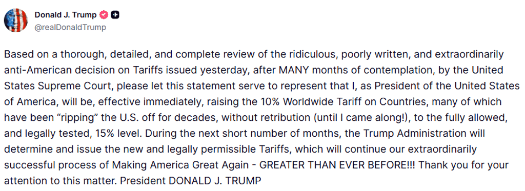 Trump erhöht weltweite Zölle nach Supreme-Court-Urteil auf 15 Prozent