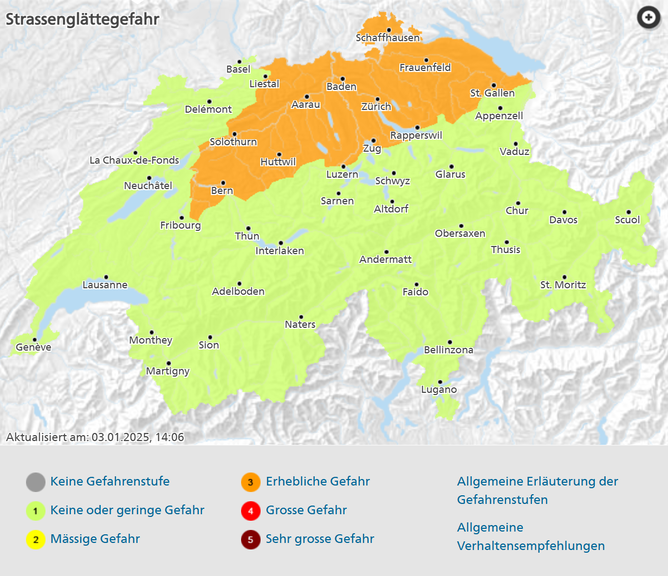 Der Grund dafür ist möglicher Eisregen: Am Freitagmittag gab der Bund eine Warnung heraus . In der Nacht von Samstag auf Sonntag sei im zentralen und östlichen Mittelland verbreitet mit vereisendem Regen zu rechnen. Die Warnung vor Strassenglätte der Gefahrenstufe 3 (erhebliche Gefahr) gilt gemäss dem Naturgefahrenbulletin des Bundes von Samstag, 4. Januar, ab 21 Uhr bis zum nächsten Morgen um 6 Uhr.