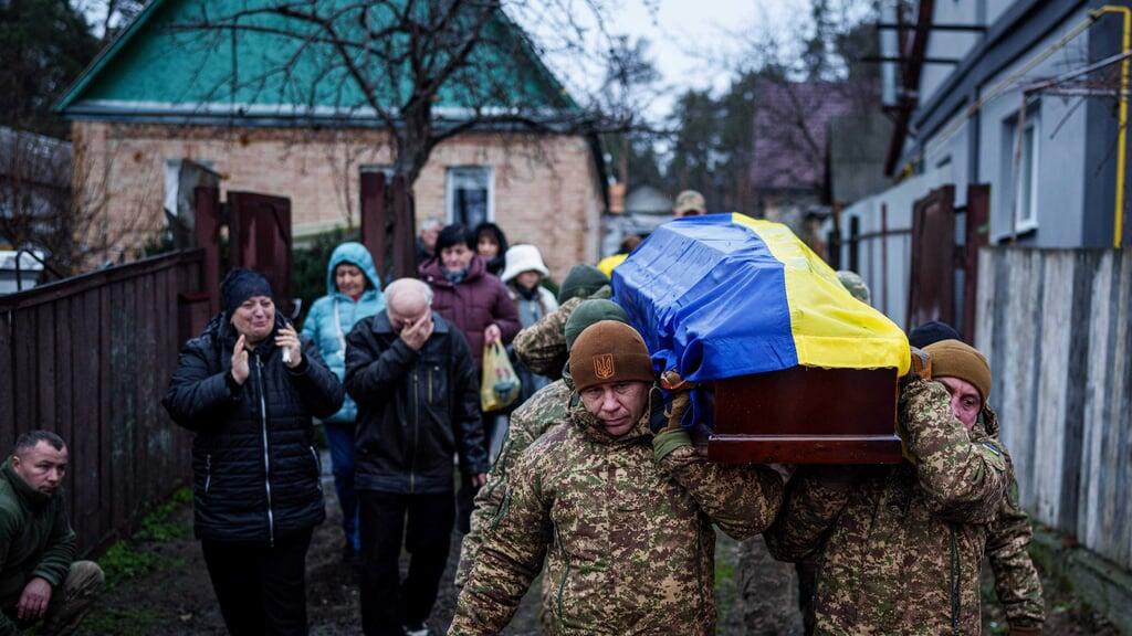 Trauernde Angehörige und Kameraden tragen in Hostomel einen gefallenen ukrainischen Soldaten zu Grabe - ob auch damit jemand Wettgelder eingestrichen hat?
