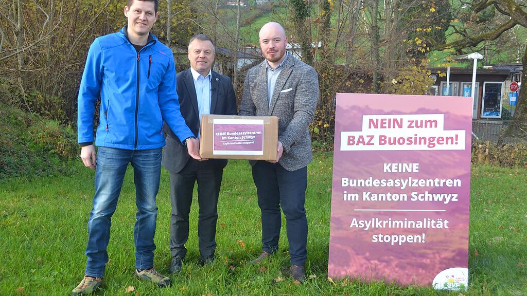 «Wir wollen keine Bundesasylzentren. Nicht in Goldau und nicht im Kanton», erklärte am Donnerstag Roman Bürgi (Bildmitte), Goldauer Nationalrat und Schwyzer SVP-Präsident. Die Regierung soll Druck in Bern machen und ihren bisherigen Entscheid zurücknehmen. Zusammen mit Xaver Blaser (Präsident IG Buosingen, links im Bild) und SVP-Kantonsrat Samuel Lütolf (Küssnacht) wurden anschliessend 3352 Unterschriften für die Initiative «Keine Bundeszentren im Kanton Schwyz» eingereicht.